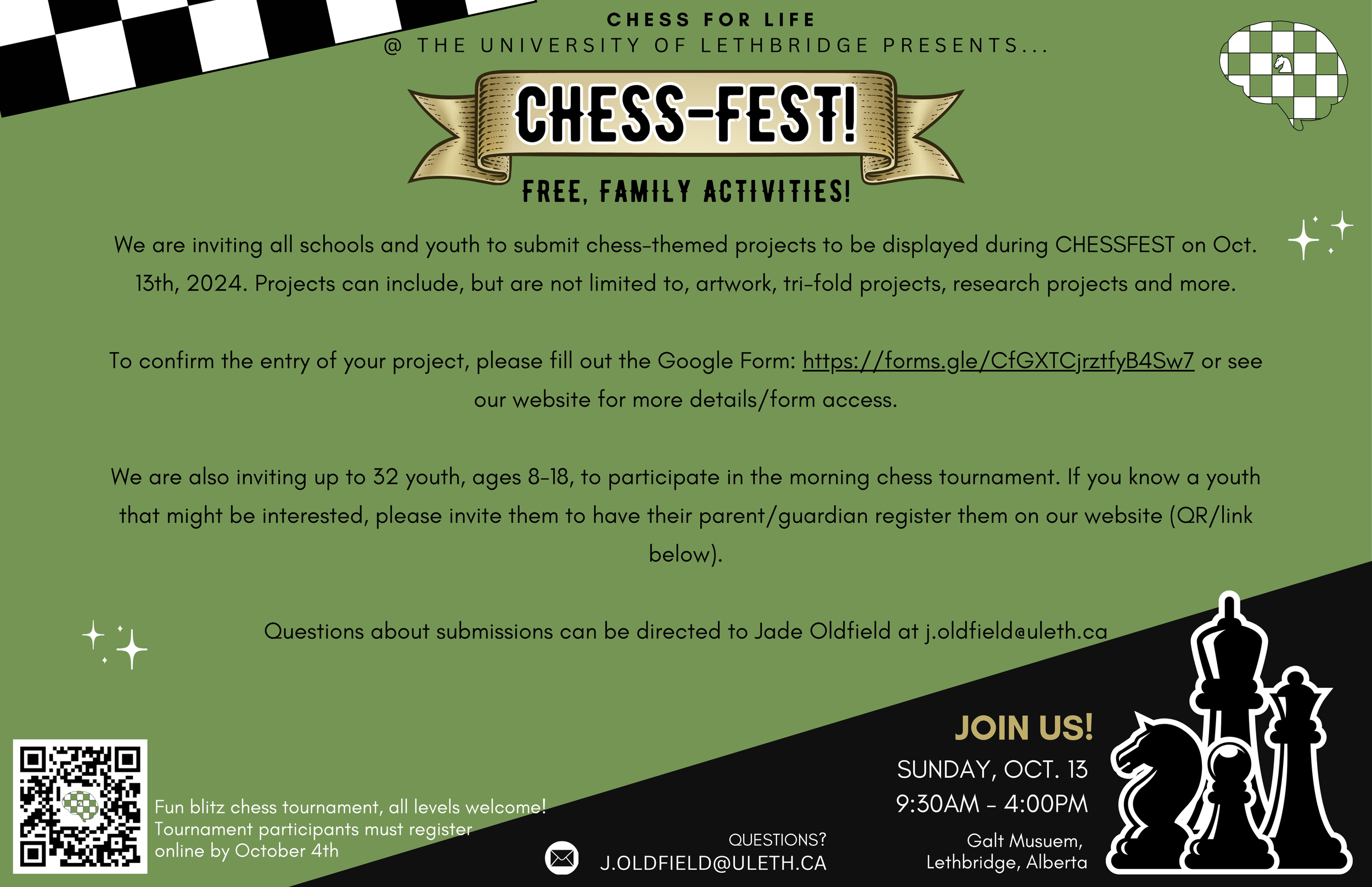 This will be an open tournament for youth ages 8-18. More details will be provided closer to the tournament, but we will start with two age groups and proceed with a swiss style competition. The tournament has now reached capacity! If you would like to waitlist, please email j.oldfield@uleth.ca.
